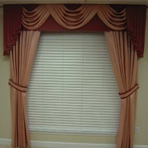 Swag & cascade: a fabric top treatment that drapes and overlaps itself across the face of the window. Usually installed with the side panels called cascades.