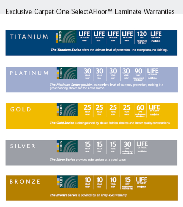 The SelectAFloor Laminate warranty system starts off on the Bronze level, offering a 10-year stain warranty. The warranty increases as you move from Bronze, to Silver, Gold, Platinum and Titanium. The length of your warranty will be determined by reference to the metal level corresponding to the product you purchased.